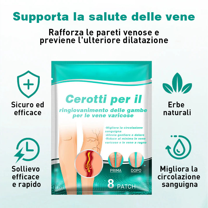 Cada parche contiene ingredientes naturales clínicamente probados que alivian eficazmente las venas varicosas y promueven la salud de la piel.